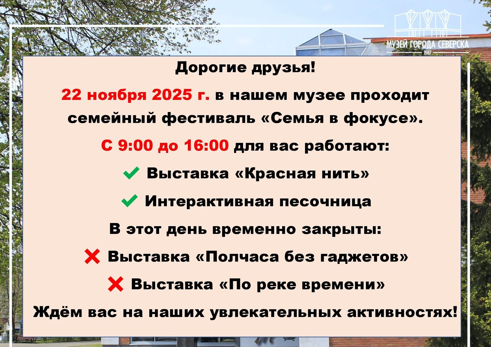 Уважаемые посетители! Обратите внимание на изменения в режиме работы нашего музея 22 ноября 2025 г.